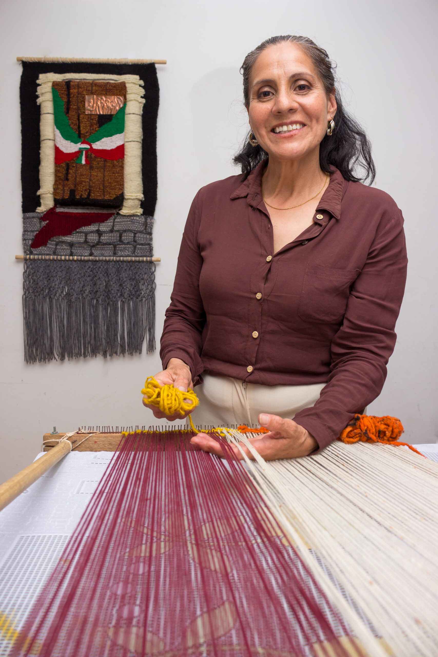 Trabaja telares mientras mueve sus brazos y pies entre urdimbres y hebras para formar telas de varios colores, texturas y diseños exclusivos que abrigan la tradición artesanal de la Tejeduría.